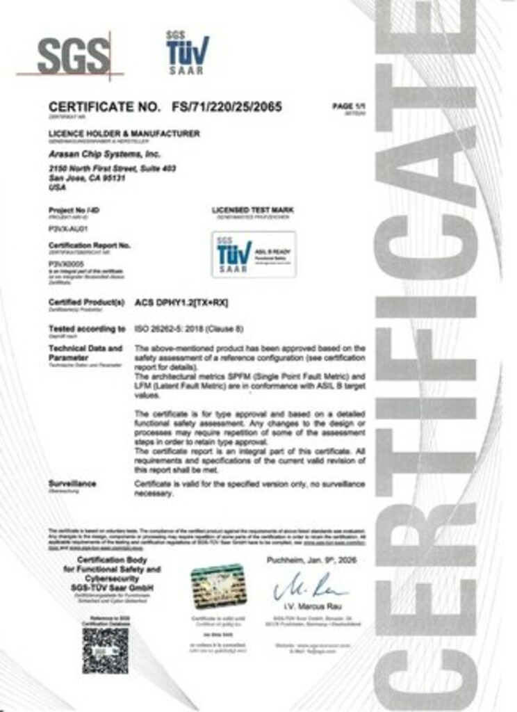 カリフォルニア州、サンノゼ, 2026年2月5日 /PRNewswire/ -- 業界初のMIPI規格向けIPプロバイダーであるArasan Chip Systemsは本日、同社の第2世代超低消費電力MIPI® D-PHY IPがISO 26262機能安全認証を取得したことを発表しました。Arasanは2005年以来MIPI Associationのエグゼクティブメンバーを務めており、最高水準の幅広いMIPI IPポートフォリオを提供しています。 ISO 26262認証を受けたMIPI D-PHY IPは、40nmから4nmまでのファウンドリノードですぐにライセンス供与を受けることができます。その他の安全性に関する資料や技術的な詳細については、NDAに基づき要望に応じて資格のある顧客のみご確認いただけます。