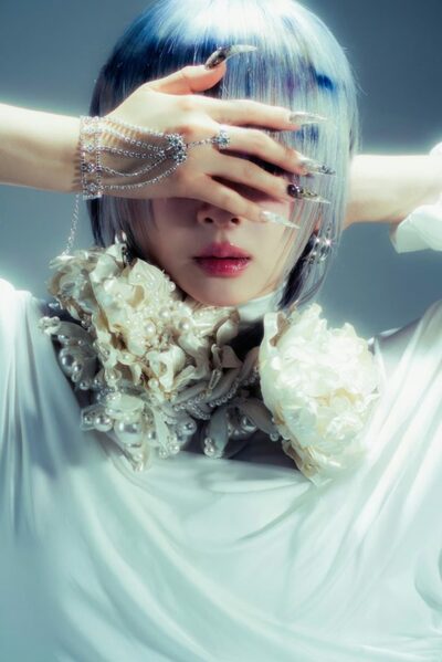 写真でチョン・ジウは、白を基調とした衣装に青みがかった髪色を合わせ、幻想的なムードを演出。花やネイルといったアイテムを取り入れ、美しさと鋭さを兼ね備えた魅力を誇った。