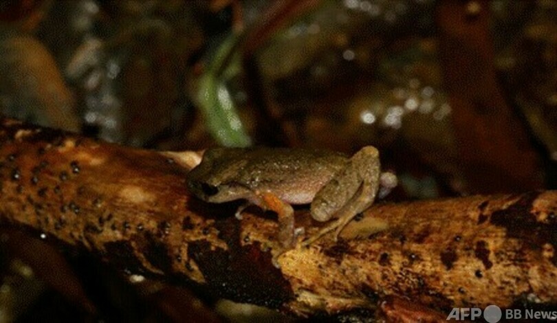 花坪掌突ガエルは小型で、雄の体長は25.0~27.6mm、雌は29.2mmです。その背部は黄褐色から濃褐色で、濃褐色の斑紋が点在しています。腹部は乳白色で、虹彩は上下で二色に分かれ、上半分は茶色、下半分は銀色です。はっきりと分かる鼓膜があり、未発達の黒い側頭ひだ(頬部のしわ)を持っています。(c)CGTN Japanese/AFPBB News
