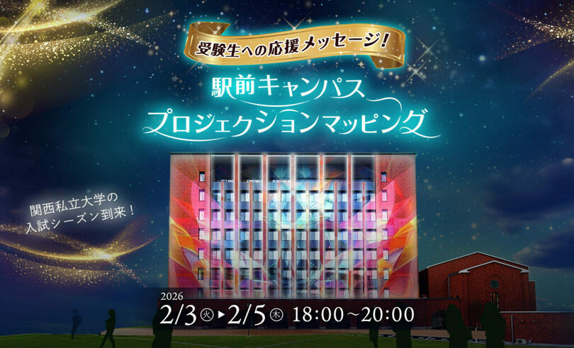 大阪成蹊大学(大阪市東淀川区/学長:中村佳正)は、受験シーズンが本格化する2月3日から5日の3日間、阪急京都線・相川駅に隣接する校舎の壁面を活用した「受験生応援プロジェクションマッピング」を実施しました。 この取り組みは、入試に挑む受験生へエールを送ることを目的としたものです。阪急電車の車窓や駅ホームから見える巨大な光のメッセージを通じて、受験生や地域住民へ勇気と感動を届けました。