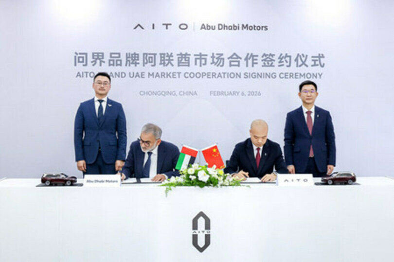中国・重慶、2026年2月9日/PRNewswire/ -- 中国の高級インテリジェント車ブランドであるAITOは、アラブ首長国連邦の大手高級自動車ディーラーグループであるPerformance Plus Motors(Abu Dhabi Motorsの子会社)と、戦略的協力契約を正式に締結しました。この契約は、中国・重慶にて、SERES AUTO海外事業部プレジデントのJason Wang氏と、Abu Dhabi MotorsのCEOであるSyed Faiz Karim氏によって署名されました。SERES AUTOの社長であるLeon He氏と、ADM中国の首席代表であるKelvin Zhao氏が、署名式に立会人として出席しました。今回のパートナーシップは、AITOが海外の高級新エネルギー車市場へ進出する上での重要な節目であり、同ブランドの次なるグローバル成長フェーズの公式な始動を示すものです。