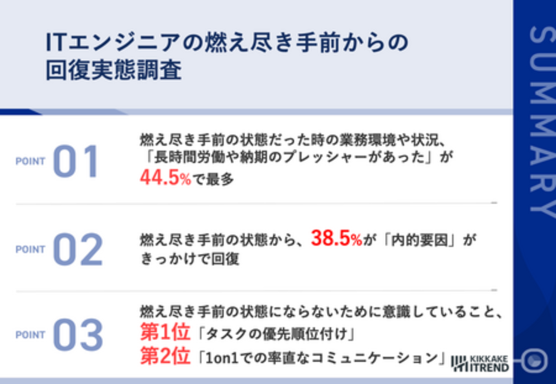 株式会社キッカケクリエイション (本社:東京都渋谷区、代表取締役:川島 我生斗)は、ITエンジニアで過去2年以内に燃え尽き症候群の手前(燃え尽きそうになった状態)を経験し、現在は回復している400名を対象に、ITエンジニアの燃え尽き手前からの回復実態調査を実施しましたので、お知らせいたします。