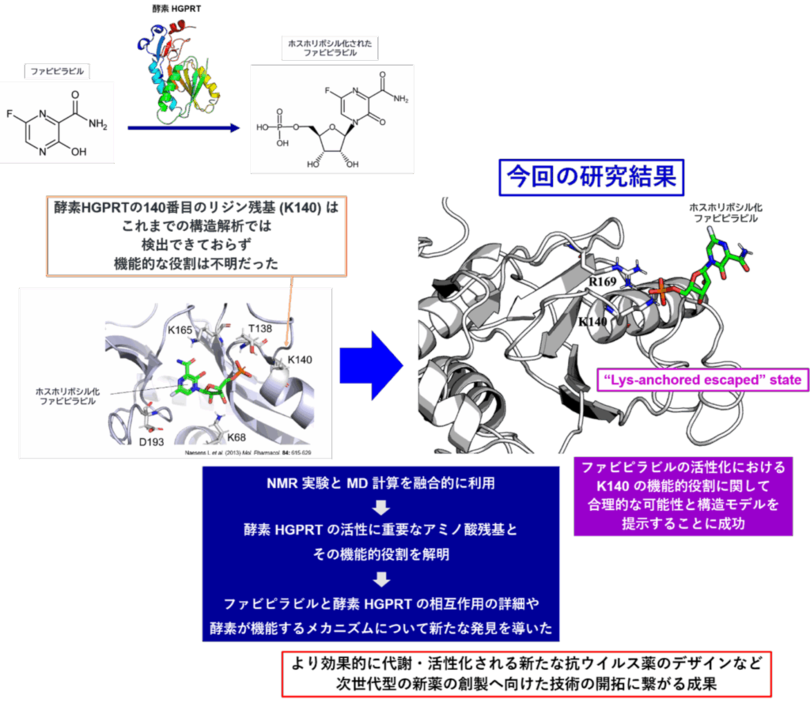 ファビピラビル※1は、ヒト体内に投与後、吸収された細胞内で様々な酵素群により代謝されることで抗ウイルス活性を発揮できるようになる「プロドラッグ」※2です。ファビピラビルが代謝される過程での律速反応※3は、酵素HGPRT※4によるホスホリボシル化※5であり、この反応効率がファビピラビルの薬剤としての有効性を大きく左右します。しかし、これまでの構造解析では、酵素HGPRTを構成するアミノ酸残基のうち、どの残基が実際にファビピラビルのホスホリボシル化に重要な寄与をしているのか十分に解明されておらず、ファビピラビルが活性型に変換される具体的な機序は未解明でした。