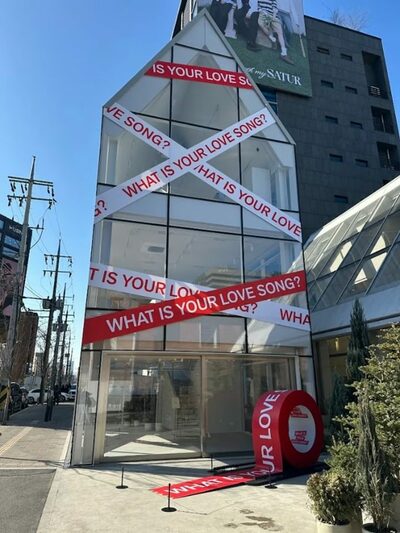 ソウルのコンベンションセンターCOEXに14日、バレンタインデーに合わせて赤いバラで埋め尽くされたアートウォールが登場。来場者が花を持ち帰ると、その背後から「WHAT IS YOUR LOVE SONG?」の文言とBTSのロゴが現れ、キャンペーンの「主役」が明かされた。
