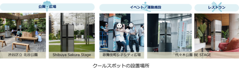 猛暑の中でも一時的に涼める場所を確保するため、渋谷エリアの公園(渋谷区立北谷公園、代々木公園 BE STAGEなど)や広場(Shibuya Sakura Stage)など5箇所に、屋外エアコン「OUTER TOWER」とミスト等を組み合わせて設置し、その効果を測りました。