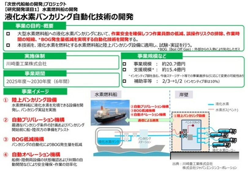 川崎重工は、国立研究開発法人新エネルギー・産業技術総合開発機構(以下、NEDO)が進めている「グリーンイノベーション基金事業※1/次世代船舶の開発」プロジェクトの一つである「水素燃料船の開発」に対して、新たな研究開発テーマとして「液化水素バンカリング自動化技術の開発」(以下、本実証事業)を提案し、採択されました。