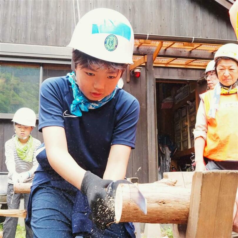 ②丸太を輪切りにする「丸太切り体験」では、丸太から「板」を切り出す「木挽き」も体験し丸太から板に加工する過程を学ぶ。