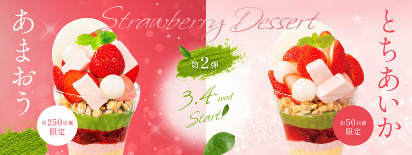 1月14日より販売している第1弾のいちごデザート「あまおうのツリーサンデー」「あまおうのパルフェ」等6品に加え、第2弾では、新たに抹茶とセミフレッドを使用したいちごデザート4品を販売します。