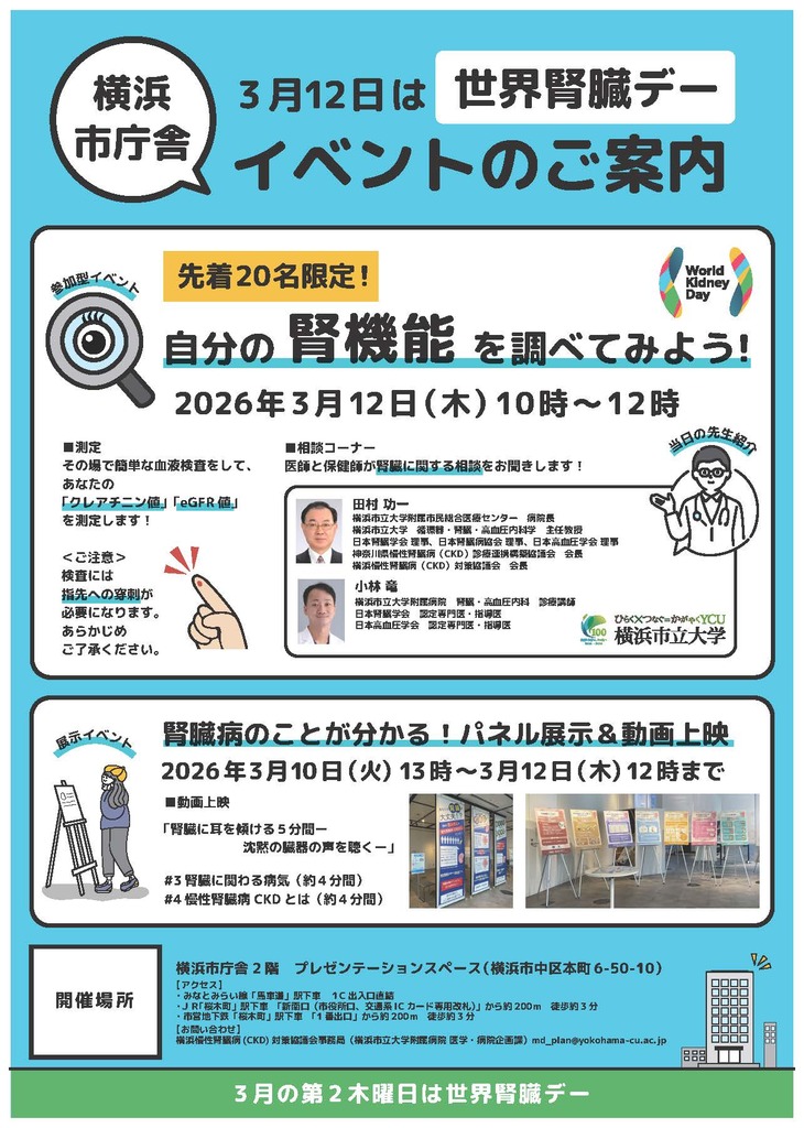 横浜市立大学附属病院が立ち上げた「横浜慢性腎臓病(CKD)対策協議会*1」が、3月12日の「世界腎臓デー*2」にあわせて、2026年3月10日(火)~3月12日(木)に横浜市庁舎2階のプレゼンテーションスペースでイベントを開催します。