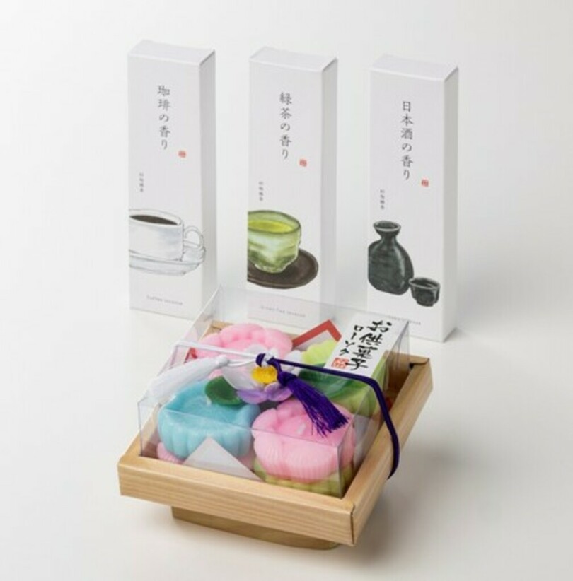 故人の好きだった香りや日常を思い出すことで、供養の時間が少しでも温かいものになれば、そんな想いから、落雁ローソクと線香(珈琲・緑茶・日本酒の香り)を組み合わせました。手にした方の心が少し和らぎ、自然な思い出話が生まれるきっかけになってほしいと願っています。