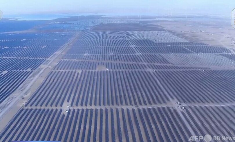 寧夏ホイ族自治区霊武市に位置するこの太陽光発電基地には、700万枚以上のソーラーパネルが設置されており、敷地面積は約8000ヘクタールに及びます。プロジェクトは現地の石炭採掘予定地、採掘跡地、地盤沈下区域などの土地資源を最大限に活用して建設されており、エネルギー開発と生態環境保護の両立を実現しています。稼働後は年間68億キロワット時のグリーン電力の供給が可能となり、約450万世帯の1年間の電力需要を満たすことができます。(c)CGTN Japanese/AFPBB News