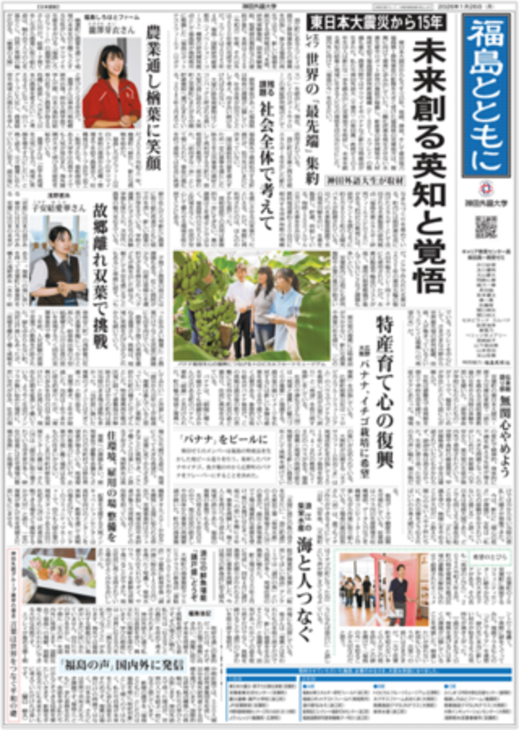 本紙は、国際系の大学である「神田外語大学の学生だからこそできること」をテーマに、行政や企業の取り組みだけではなく、福島で活動する人々の声や思いを大切に、福島の「今」を多面的に世界に伝えることを目的に制作されました。