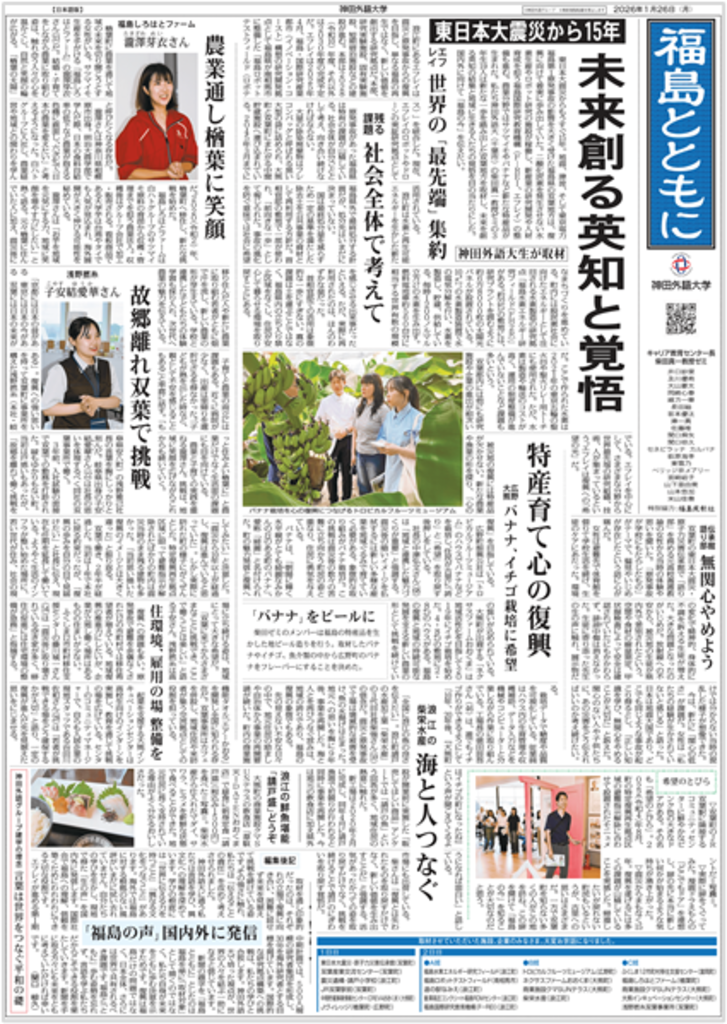 神田外語グループ(東京都千代田区/理事長:佐野元泰)は、東日本大震災・原子力災害から15年の節目にあたり、福島の復興と学生の学びを世界に発信する「震災復興発信プロジェクト」を展開しています。その一環として、グローバル人材の育成を目指す神田外語大学・柴田真一ゼミの学生19名が、福島県浜通り地域での取材をもとに、日英版の震災復興新聞『福島とともに(英題:”Together with Fukushima”)』を完成させました。このたび完成した本紙を、2026年3月4日(水)に復興庁へ贈呈する予定です。あわせて、同プロジェクトの成果物の一つとして制作した震災復興ビールも贈呈します。本贈呈式は、学生による取材と学びの成果を、復興大臣へ届ける機会として実施します。