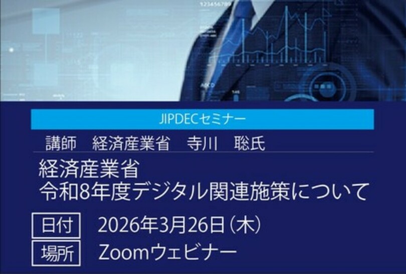 一般財団法人日本情報経済社会推進協会(以下JIPDEC)は、2026年3月26日(木)に、JIPDECセミナー「 令和8年度 経済産業省デジタル関連施策について」を開催いたします。