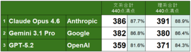 理三合格レベルも突破!! 最高得点はClaude(Opus4.6)で9割に迫る。
