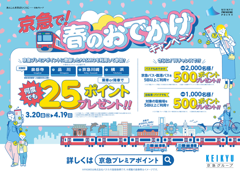この春は京急を使って都心・川崎・横浜へおトクにおでかけ!乗車ごとに25pt付与!さらに総勢3,000名に当たるW(ダブル)チャンスも!