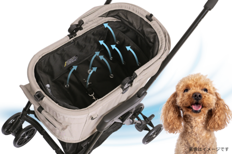 本製品は、外気を取り込み、シートに配置した12個の空気噴出口から風を送り出す仕様です。マットが折れ曲がった状態で設置しても、回転するダクトで空気の通り道がつぶれない「Wエアダクト構造」を採用。ペットの足元からキャリー全体へ風をムラなく行き渡らせることができ、移動中の乗り心地を高めます。