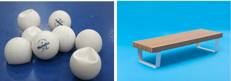 競技現場では日常的に大量の破損球が廃棄されるという課題があるが、北田さんはそこに潜む“未利用資源”としての価値に着目。フクビ化学工業株式会社(福井県福井市/代表取締役会長CEO:八木誠一郎)の協力を得て、破損球を再生素材へと再加工し、環境に配慮したベンチとして形にした。