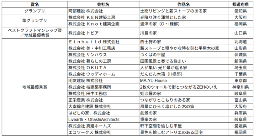 新築部門のグランプリには阿部建設株式会社さま(愛知県)施工による「土間リビングと薪ストーブのある家」が選ばれ、リフォーム部門のグランプリには株式会社イン&エムスクエアさま(福岡県)施工による「朽網の古民家リノベーション」が選ばれました。