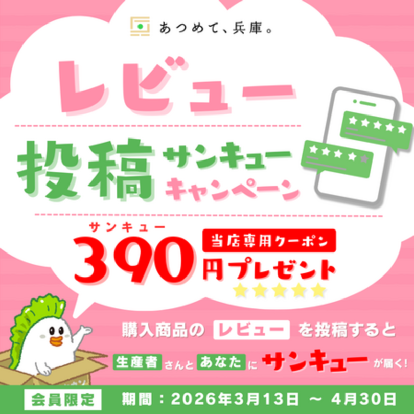 JAタウン「あつめて、兵庫。」でご購入の税込1,950円以上の商品について、期間中にレビュー投稿いただいた会員様に、当ショップ専用クーポン(390円分)をプレゼントいたします。
