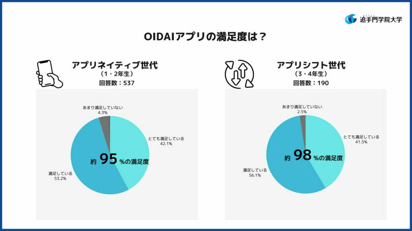 総合的な満足度については「とても満足している」「満足している」の合計が96%、世代別では、アプリネイティブ世代で約95%、アプリシフト世代で約98%が満足していると回答し、両世代とも100%が「大学生活が便利になった」と回答した。また、導入前後の違いを経験しているアプリシフト世代では、92.8%が「情報の届きやすさが改善された」と回答し、利便性の向上や主体的な情報収集に貢献していることがわかった。
