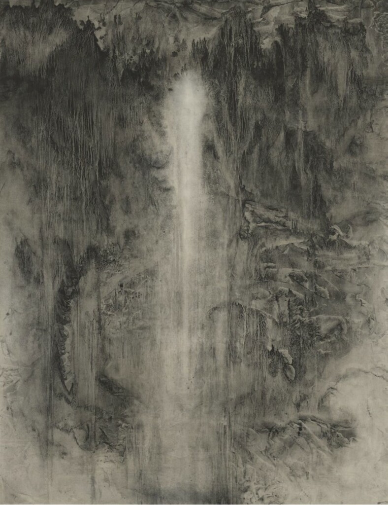 私が使用する《古墨》は、何十年・何百年もの歳月が経っている。長い時間を固形の《墨》という形の中に押し込められていた《煤》に、清らかな水を与え、硯でほぐすことで、長い眠りから目覚めさせ、現代に解き放つ。その粒子を、水と共に筆で吸い上げ、紙の上に走らせる。水の中に分散している墨の粒子は、画中で踊り、揺らぎ、ゆっくりと沈む。やがて水が引き、粒子が紙の上に『現象』を浮かび上がらせるのだ。そこには、墨が経た時間をも内包している。