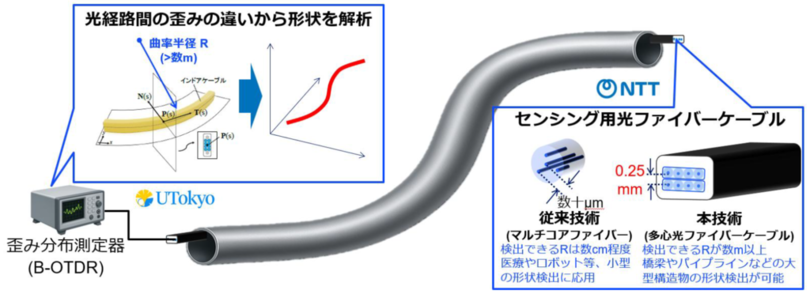 NTT株式会社(本社:東京都千代田区、代表取締役社長:島田 明、以下「NTT」)と国立大学法人東京大学大学院工学系研究科(所在地:東京都文京区、研究科長:加藤泰浩、以下「東京大学」)は、既存の光ファイバーケーブル構造を活用したセンシング用光ファイバーケーブルを用いて非常に緩やかな形状変化(数m以上の曲率半径)を検出できる光ファイバーセンシング技術を世界で初めて実証しました。