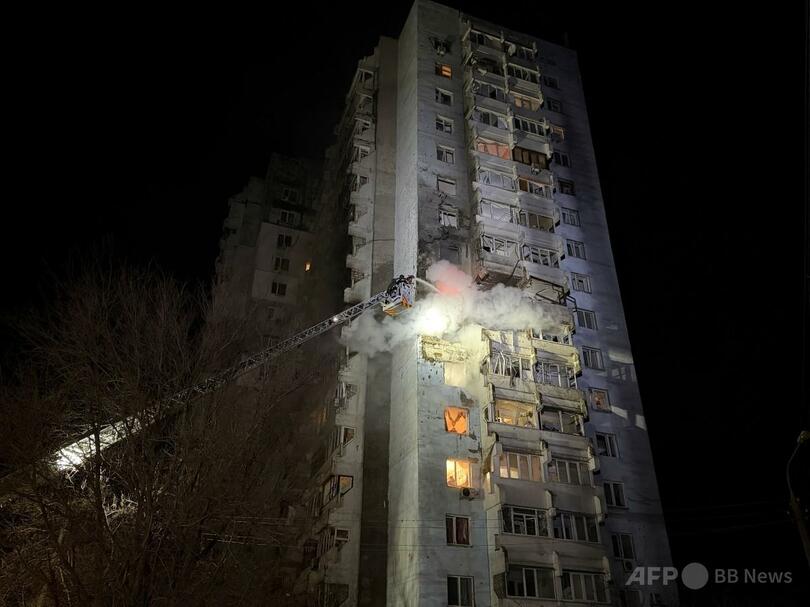 また東部ハリコフ州の検察当局によると、走行中の列車に無人機が直撃し、乗客の男性(61)が死亡した。AFPが集合住宅の火災を確認したザポロジエ州では「ミサイルと無人機による大規模な攻撃」により1人が死亡、少なくとも9人が負傷した。南部ヘルソン州でも、自宅にいた1人が死亡した。(c)AFP/Stanislav DOSHCHITSYN with Darya NAZAROVA in Zaporizhzhia