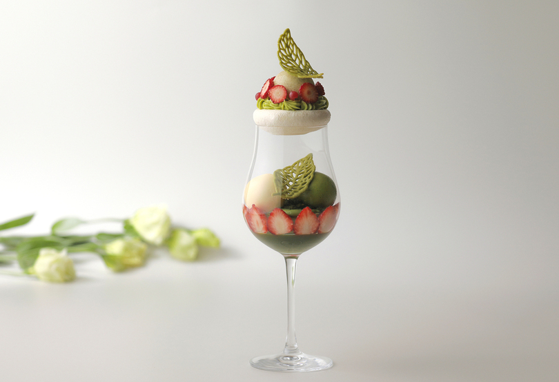 本商品は、お茶の発祥の地として知られる滋賀県の個性豊かな3種の茶に着目し、季節の移ろいを軽やかに表現したパフェ。抹茶はアイスクリームとクリームで奥行きのある味わいに仕立て、ほうじ茶は香ばしさを生かしたメレンゲで軽やかに添え、緑茶は透明感のあるゼリーとして爽やかな余韻を残す構成です。グラスの中で重なる層が、味覚だけでなく視覚にも心地よいリズムを生み出し、一口ごとに異なる香りと味わいがゆるやかに広がります。全体を通して甘さを抑え、初夏の午後にも心地よくお召し上がりいただける仕立てとしました。