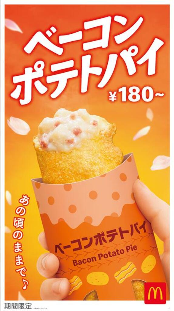 1990年に初登場し35年以上経った今もなお、販売するたびに多くのお客様にご好評いただいているマクドナルドの春の定番商品の「ベーコンポテトパイ」は、ひと口食べれば、サクサクのパイ生地から溢れ出す、ホクホクのポテトにスモーキーなベーコン、オニオンなどの具材に、ミルクを使用したとろ〜りクリーミーなフィリングが絶妙なハーモニーの一品です。ほっと一息つきたい時、少し時間が空いた時、小腹がすいた時など、身も心もほっこりしていただける「ベーコンポテトパイ」を、桜舞い散るお花見シーズンのお供としてお楽しみください。