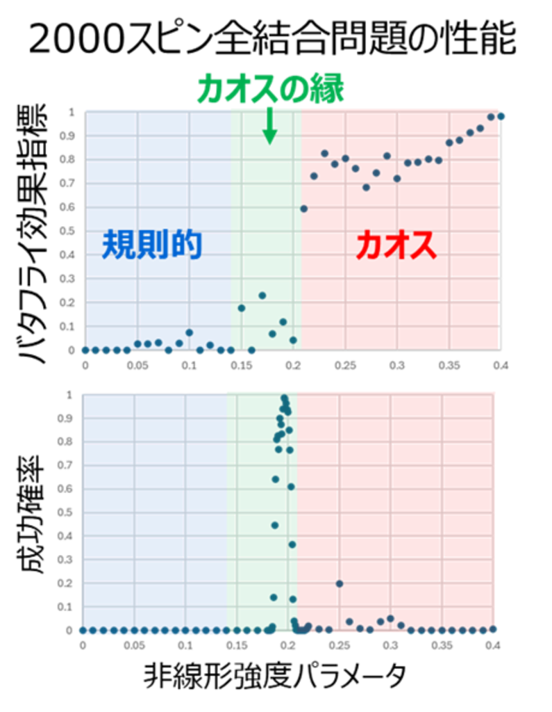 さらに、その原理を追求するため、第3世代SBMにおけるダイナミクスを詳しく調べ、非線形強度パラメータが小さいときは規則的な振る舞いを示し、大きいときはカオスとなることを明らかにし、そのちょうど境界にあたる“カオスの縁”において、局所最適解に陥ることなく大域最適解に到達する成功確率の急向上が観測されることを発見しました(図1)。