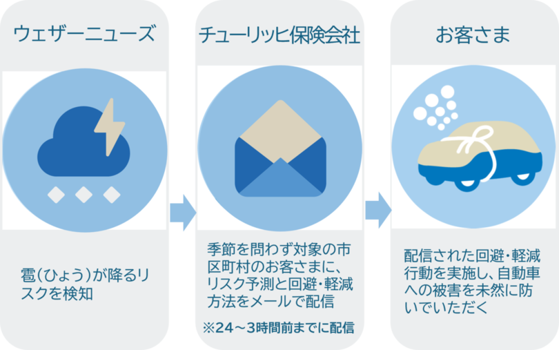 本サービスは、ウェザーニューズ社の気象データ提供サービス「WxTech(R)」の「ひょうリスク予測API」のデータをもとに、ひょうの発生が予測される市区町村にお住まいの対象ご契約者さまへ、被害発生前に注意喚起のメールを配信します。