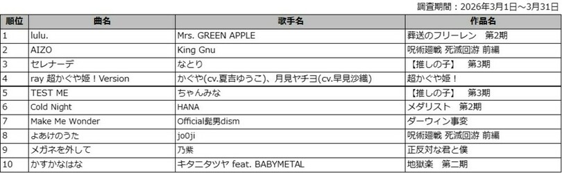 DAM 2026年冬アニメ主題歌カラオケランキングTOP50発表『葬送のフリーレン』第2期オープニングテーマMrs. GREEN APPLE「lulu.」が1位