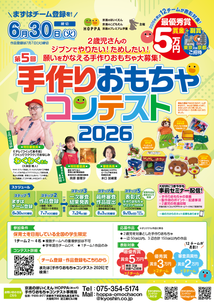 全国に95園の保育施設を展開する京進グループのHOPPA(※)は、全国の保育士養成校(大学・短大・専門学校)に在籍する学生を対象に、「手作りおもちゃコンテスト2026」を開催いたします 。