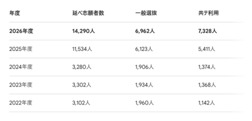 • 志願者数が過去最多を更新: 一般選抜・共通テスト利用選抜の合計が14,290人(前年度より2,756人増加)。