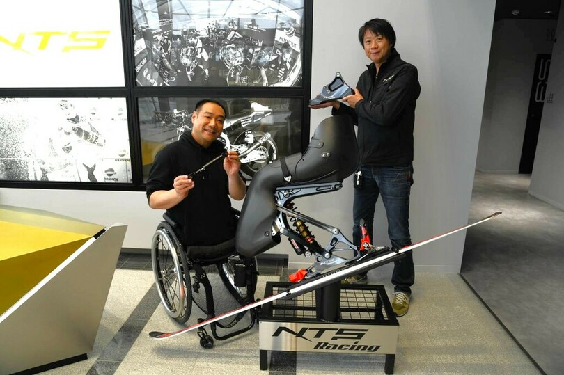 パフォーマンスダンパーを持つ鈴木猛史選手(左)とチェアスキーの開発協力をしたエヌ・ティー・エス社の生田目將弘社長
