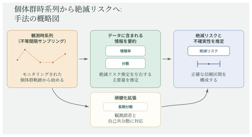 絶滅リスクの定量評価は、IUCNレッドリストやCITESなど、現代の保全評価における重要な要素です。しかし、短い、あるいはノイズの大きい生態時系列データから絶滅確率をどこまで信頼して推定できるのかについては、長年議論が続いてきました。特に、利用可能なデータが限られている場合、信頼区間が0から1のほぼ全域に広がってしまい、推定値が実用的な意味を持たなくなるのではないか、という懸念がありました。
