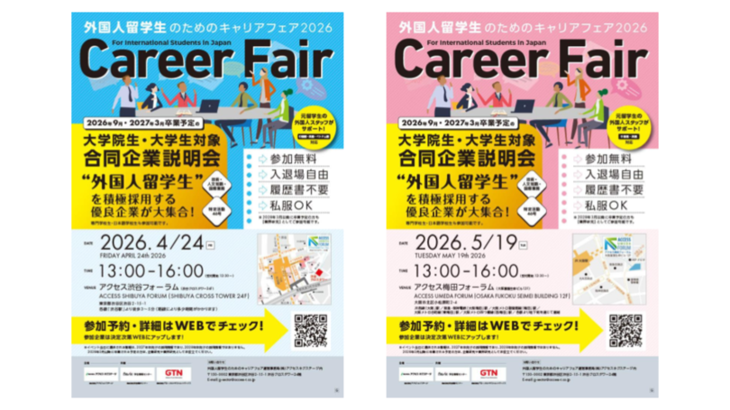 外国人に特化し、住まい・就労・通信・金融など日本での暮らしを支えるサービスを包括的に提供する株式会社グローバルトラストネットワークス(本社:東京都豊島区、代表取締役社長:後藤裕幸、以下「GTN」)は、株式会社学生情報センターおよび株式会社アクセスネクステージとともに、日本での就職を希望する外国人留学生を対象とした合同企業説明会「外国人留学生のためのキャリアフェア2026」を共催いたします。東京会場は2026年4月24日(金)、大阪会場は5月19日(火)に開催し、積極的に外国人留学生を採用する企業の人事担当者が参加します。