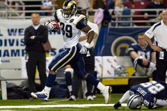 ダラス・カウボーイズ戦で3回のタッチダウンランを含む25回のキャリーで160ヤードを獲得したセントルイス・ラムズのスティーヴン・ジャクソン(%%Steven Jackson%%、左)。(2008年10月19日撮影)(c)AFP/Getty Images/Dilip Vishwanat