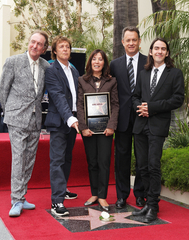 写真は14日、米ハリウッドで行われた記念セレモニーに出席した、ハリスン氏の妻オリビア(Olivia Harrison)さん(中)と息子のDhaniさん(右)、歌手ポール・マッカートニー(Paul McCartney、左2)、俳優のエリック・アイドル(Eric Idol、左)とトム・ハンクス(Tom Hanks、右2、2009年4月14日撮影)。(c)AFP/Getty Images/Vince Bucci