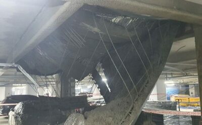 江西警察署などによると、壊れたのは、新築建造物の地下駐車場4階の天井コンクリート。警察関係者は「地下駐車場の天井が崩れ、地下5階に落ち込んだ」とみている。