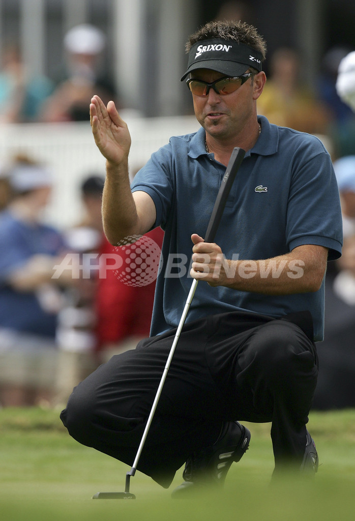 写真は、17番で慎重にラインを読むアレンビー。(c)AFP/Getty Images David Cannon