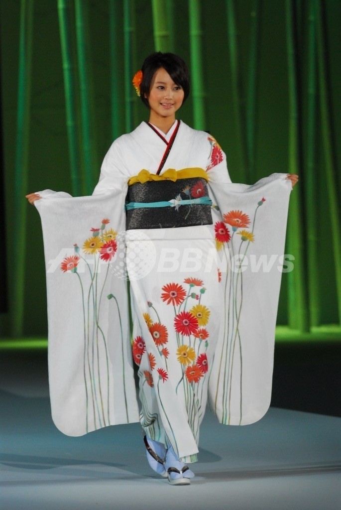 着物ショーのステージでは、女優の堀北真希(Maki Horikita)が浅井麻衣子作の白地に鮮やかな花を描いた可憐な振り袖姿を披露。また、昨年度準ミス・ユニバースの知花くらら(Kurara Chibana)も登場し、フェンディのゴージャスな白のファーコートやベージュのドレスをまとい堂々とキャットウォークをみせた。