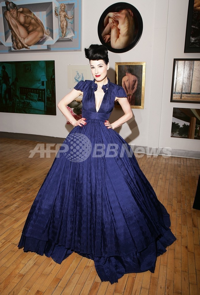 膝丈のダークグリーンのドレスと、驚くほどヒールの高いシューズ姿で登場したディータは、「ランジェリーが私の初恋だったの」と語る。「ランジェリーの歴史に興味を持って学んでいたら、ピンナップ・ガールたちの写真に出会ったの。そして、ピンナップ・ガールからバーレスクのスターたちを知った。それが始まりよ」