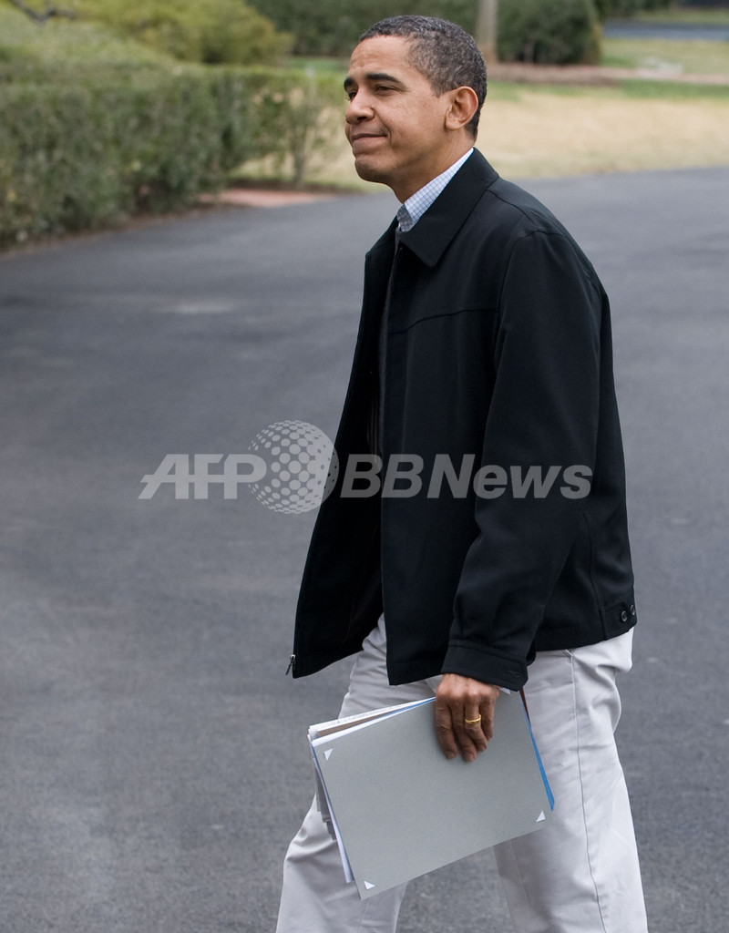 バラク・オバマ(Barack Obama)米大統領は8日、家族で滞在した米メリーランド(Maryland)州の米大統領山荘キャンプデービッド(Camp David)から、大統領専用ヘリ「マリーンワン(Marine One)」でホワイトハウス(White House)に戻った。写真はオバマ大統領(2009年3月8日撮影)。(c)AFP/Saul LOEB
