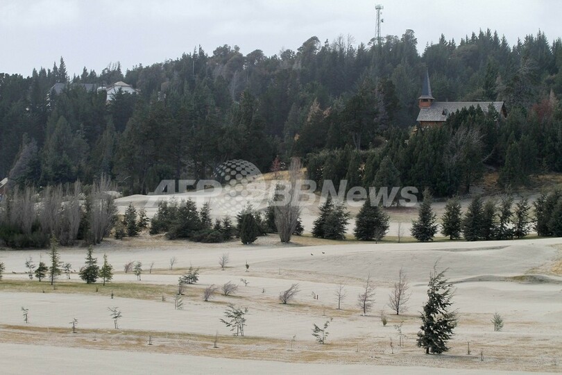 写真は、アルゼンチンの首都ブエノスアイレス(Buenos Aires)南方1600キロのバリロチェ(Bariloche)のゴルフコースに降り積もったプジェウエ山の火山灰(2011年6月5日撮影)。(c)AFP/Francisco Ramos Mejia