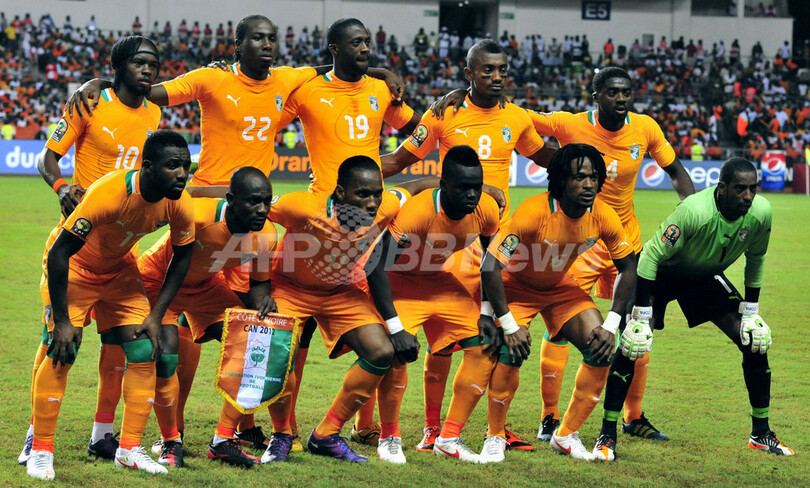 試合前の写真撮影に臨むコートジボワールの選手(2012年2月8日撮影)。(c)AFP/ISSOUF SANOGO