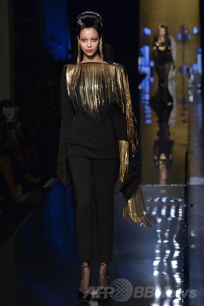 9日には、 「ジャンポール・ゴルチエ(Jean-Paul Gaultier)」が新作を発表。ランウェイには欧州国別対抗歌謡祭「ユーロビジョン・ソング・コンテスト(Eurovision Song Contest)」優勝者でひげを生やしたドラァグクイーン(女装パフォーマー)として一躍話題となったコンチータ・ウルスト(Conchita Wurst)さんも登場した。(c)AFP