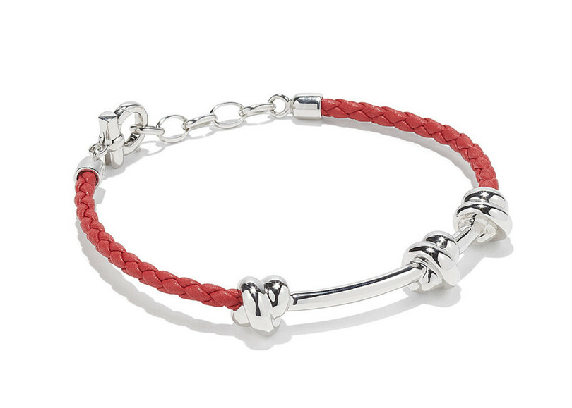 小さなシルバーのノットが3つならんだレザーブレスレットは、ブラック、ブルー、レッドの3色展開。留め金の位置によってサイズ調節も可能。スターリングシルバーとレザーのコンビネーションが上品で美しいブレスレットは、恋人に限らず家族や大切な友人への贈り物や記念品としても最適だ。価格は3万8000円(税抜)。