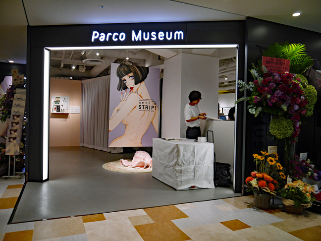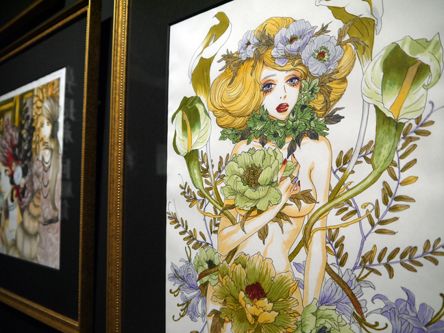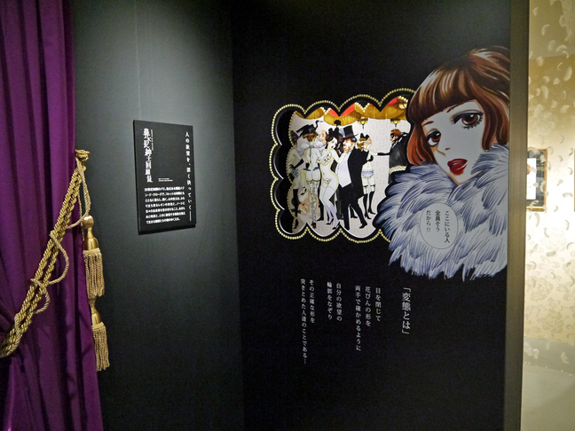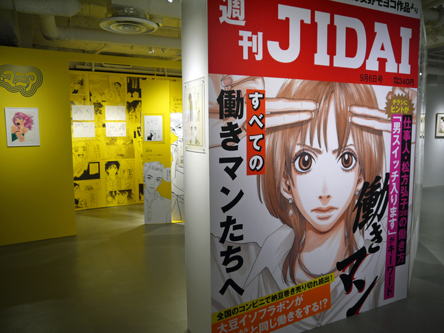 会場入口では、女性のヌードイラストに、脱ぎ捨てられたピンクのコルセットを合わせてディスプレイ。『働きマン』には巨大な雑誌、『さくらん』には金屏風が組まれるなど、ストーリーと連動した演出が魅力だ。そのテーマパークのような空間について「アートディレクターの吉田ユニ(Yuni Yoshida)さんが作品の世界観にあわせて考えてくれた」と安野は楽しげに説明する。